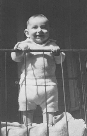 Douglas pulls himself to standing in his crib, Sept. 1933