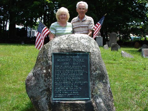 | With Betty Jo at the Whitehall Burial Ground, Mystic CT, 2011. The memorial plaque for our ancestor Robert Parke was erected by his descendants in 1930, 300 years after his arrival in the American colonies. |