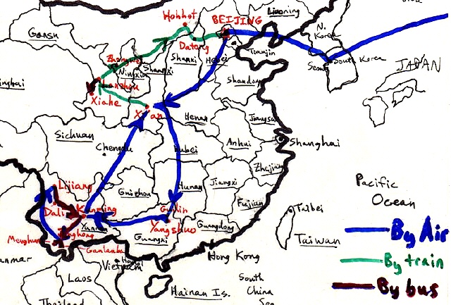 Travel Journal: China (August-September 1999) by Mischa Park-Doob In my 2nd year of college at the University of Chicago (1998-1999), I studied 1st year Chinese. After the end of the school year, I continued at the 2nd year level in the 8 week Princeton in Beijing summer language program, held each year at Beijing Normal University. Although my classmates were mostly Americans, we were forbidden to speak any language other than Chinese for the duration of the program, and the lively neighborhood along Xin Jie Kou Wai street provided more than adequate immersion for learning the language. Immediately after the program's end, I embarked on a 23 day trip around southern and western China, documented below. Click here for a map of China--the places I visited