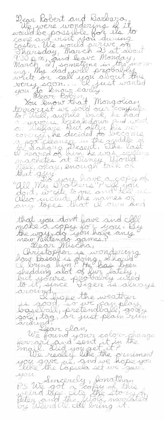 March 1989 letter to Robert, Barbara, Robin, Mischa & Ian