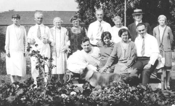This family group around Wilford's sick bed includes Wilford, Lila, Leta and Clifford on cot, Effie, Watson, ??, Lura, ??, ??, ??, ?? behind, August 1928