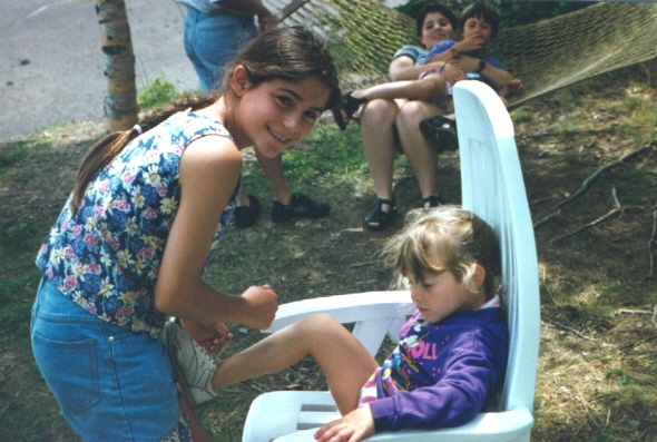 Charise tying Chelsea's shoe--in the background, Leta holding Lila