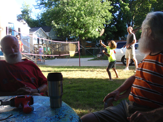 James & Robert relax next to badminton court in the back yard of Warren's rented house
