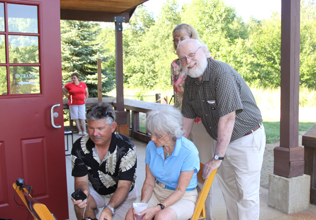 Kevin works on connecting with Douglas in Florida via Skype while Betty, Warren and Patty look on