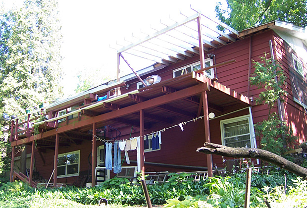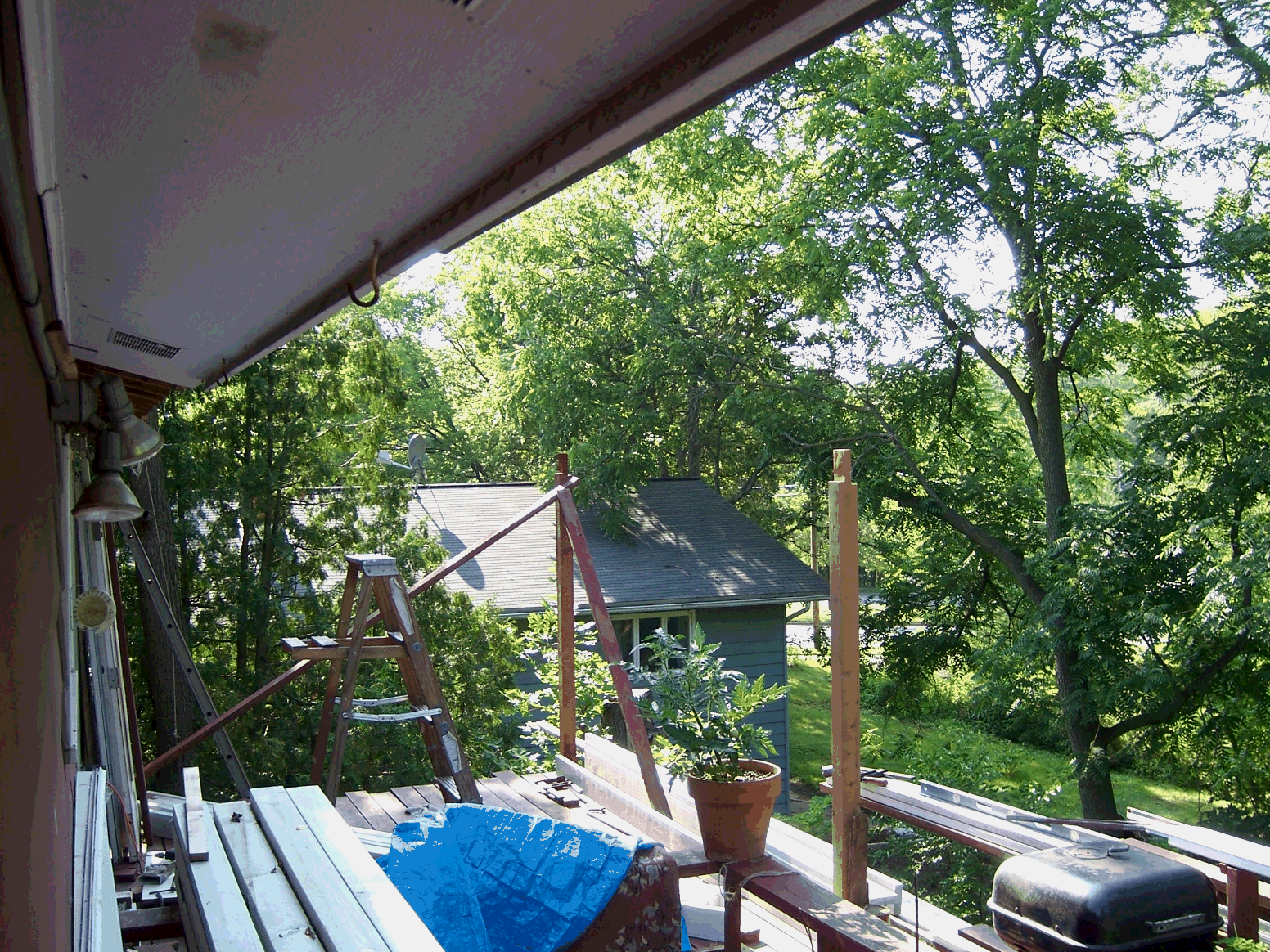 Loss of the oak tree meant loss of shade on our deck. My response was to build a screen porch on that end of the deck. Here is the back of the house after screen porch construction was begun in 2006.