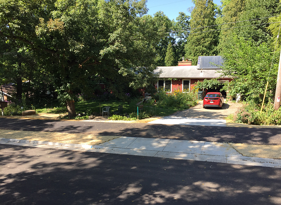 Finally, new curbing was in and asphalt laid for the bike path and (bottom) street, 8/25/23. When they replaced the entrance to our driveway we asked for concrete rather than asphalt.