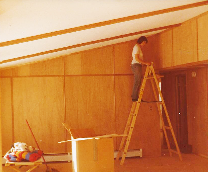 We decided to use clear urethane on the wooden wall panels. Here is Barb on her step ladder in Feb. 1979