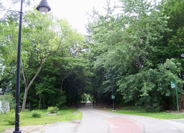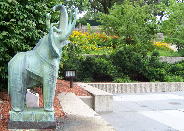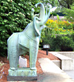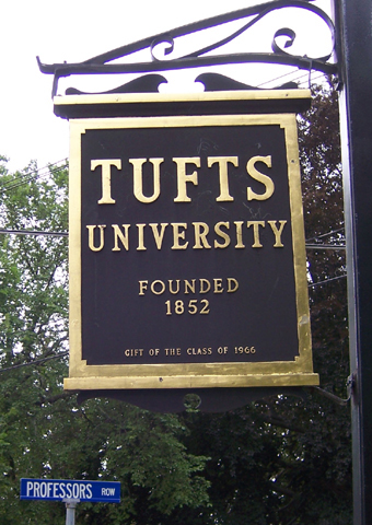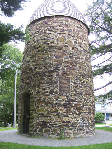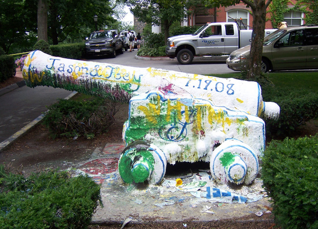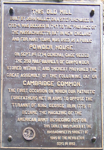 Barb took the subway to her pre-conference meeting in Boston. Margot lent me one of her bicycles and I spent the morning and early afternoon biking around Cambridge, Somerville and Arlington. I went first to the bike trail a few blocks northwest of Fairfield St. that Margot had told me about. I biked to its southwest end at the Alewife MBTA Terminal, then headed back up and followed the section north of Massachusetts Ave. to its northeast end in Somerville. Since I only had the Cambridge map Margot had provided, I only had a rough idea of where I was, but I headed west and discovered the Powder House Square area with its Nathan Tufts Park. There I photographed the round stone tower that had served as a powder storehouse in 1700s. (See the plaque on its side.) Next I discovered Tufts University right across the street (in Medford), and spent the rest of the morning exploring it.   I had seen its stone chapel tower atop the hill from the distance and wondered about it. Near the chapel was a replica of an old cannon with many coats of paint, the center of a student tradition at Tufts. I briefly joined a campus tour group until it passed the student union, and I stopped in there. After seeing most of the upper and lower campuses I returned to where I had locked the bike, near a statue of an elephant with a rider on a terraced campus hillside. (The school mascot is Jumbo the elephant.) I biked up Broadway to Arlington. After Broadway ran into Massachesetts Ave. I continued up it (thinking I was headed toward Cambridge) and stopped at the Jason Russell House, a 1740 farmhouse on the National Register of Historic Places and site of "the bloodiest fighting between the Minutemen and Redcoasts on the first day of the American Revolution, April 19, 1775". It and the adjacent Smith Museum of Arlington History were closed (open only on weekends). I headed up Mass Av as far as the Foot of the Rocks plaque (which also talks about the April 19, 1775 fighting) before turning around and biking back to Cambridge.