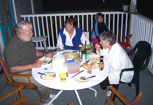 Barb and Margot took took Tavery to a new day camp this morning. Late in the morning we said goodbye to Margot and took Warren to the airport around noon. Then Barb and I drove back west to the Selkirk cottage on Lake Ontario. There we found that Bill and a guest, his friend Jim, were visiting next door. The four of us went out for supper to a nice restaurant in Pulaski near the Salmon River that Bill had not visited before. Jim is retired from the arts job that Bill got him into years ago, but he continues to serve as organist and choir director at an Episcopal church. Barb and he talked at length (her voice having recovered enough to allow her to talk).