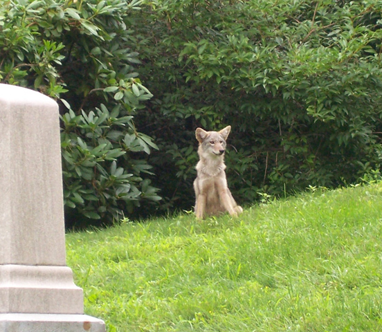 I biked to Mt. Auburn Cemetery, "America's first landscaped cemetery", and took photos there, including photos of the grave of Hosea Ballou, Buckminster Fuller and Mary Baker Eddy. I took photos of and from the Tower on the Hill. I also photographed a young coyote who seemed unconcerned about me walking by, but disappeared into the bushes when a grounds keeper's truck came by. As he disappeared from sight I saw his long bushy black tipped tail.