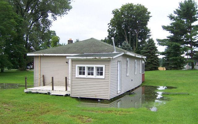 With Barb still in bed with the heating pad on her back, I had breakfast and took a walk up the road as far as River View Rd. Some of my photos show puddles of water left by last night's rain. After Barb had breakfast we drove into Pulaski and I drove around and took photos of the town while Barb shopped at the grocery store. Later Barb and I got the canoe in the water and paddled up the river past the bridge. There is more water in the river this year and we were not able to go as far upstream as before because the flow was too fast where it was shallow. We got as far as a beaver dam on the far left (facing upstream). Barb took some photos of it with her camera.