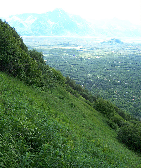 Another view of the valley from farther up the Lazy Mountain Trail, showing the slope of the mountainside.