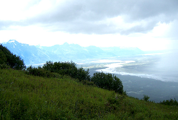 View of the valley from farther up the Lazy Mountain Trail. Rain can be seen encroaching from the right. I turned around here as I felt a couple of drops. 7/26/06