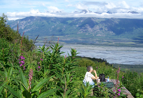Another view of the Knik River valley with Barbara at the Pioneer Ridge-Knik River Trail picnic table.