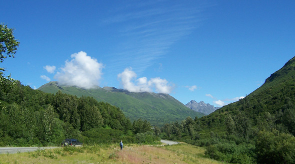Clouds scratching their bellies on nearby mountain tops on the way to Hatcher Pass, Barb in center.