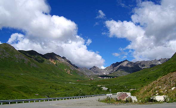 The buildings ahead are at Independence Mine, on the road to Hatcher Pass. From that point on the road was unpaved.