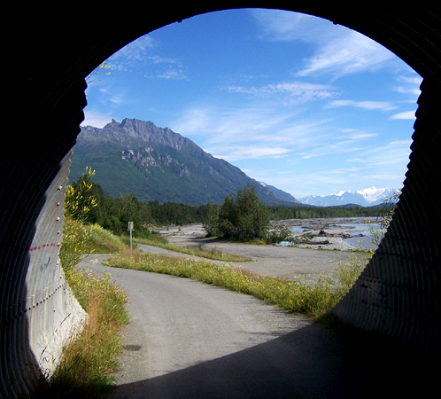 Bike path along the Matanuska River where it passes under the Old Glenn Highway at the river bridge.