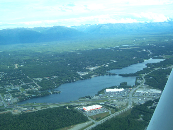 Lake Wasilla from the air. The white building at the left edge, near the end of the lake, is the 3 story building where Casey has her office.