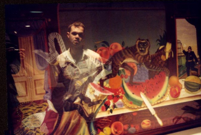 Folk Art Museum, Colonial Williamsburg. Art work with monkeys, with Daniel's reflection in glass.