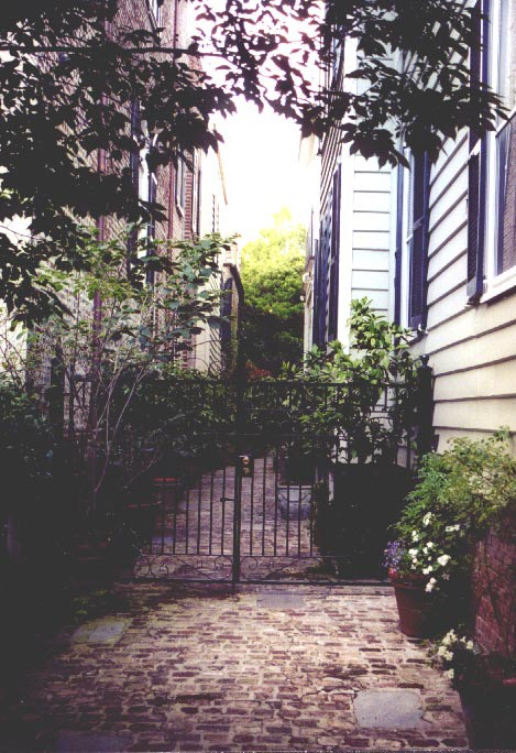 Charleston SC: cobblestone driveway between old town historic homes.