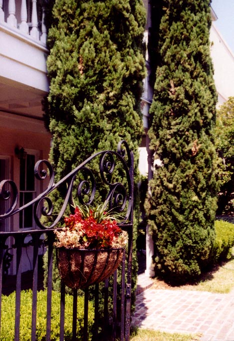 Charleston SC: planter on wrought iron gate at an old mansion.