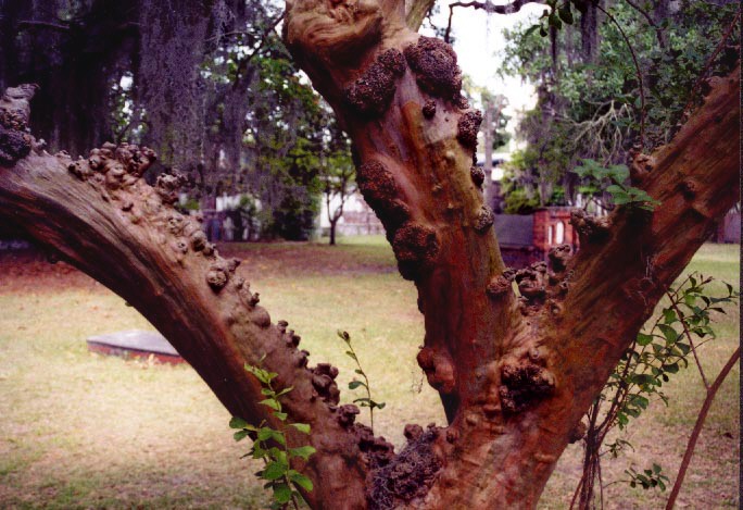 Knobby bark on old tree in the colonial cemetery in Savannah, GA.