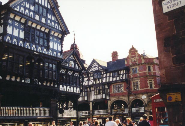 A main commercial area in Chester with entire blocks of original medieval buildings.