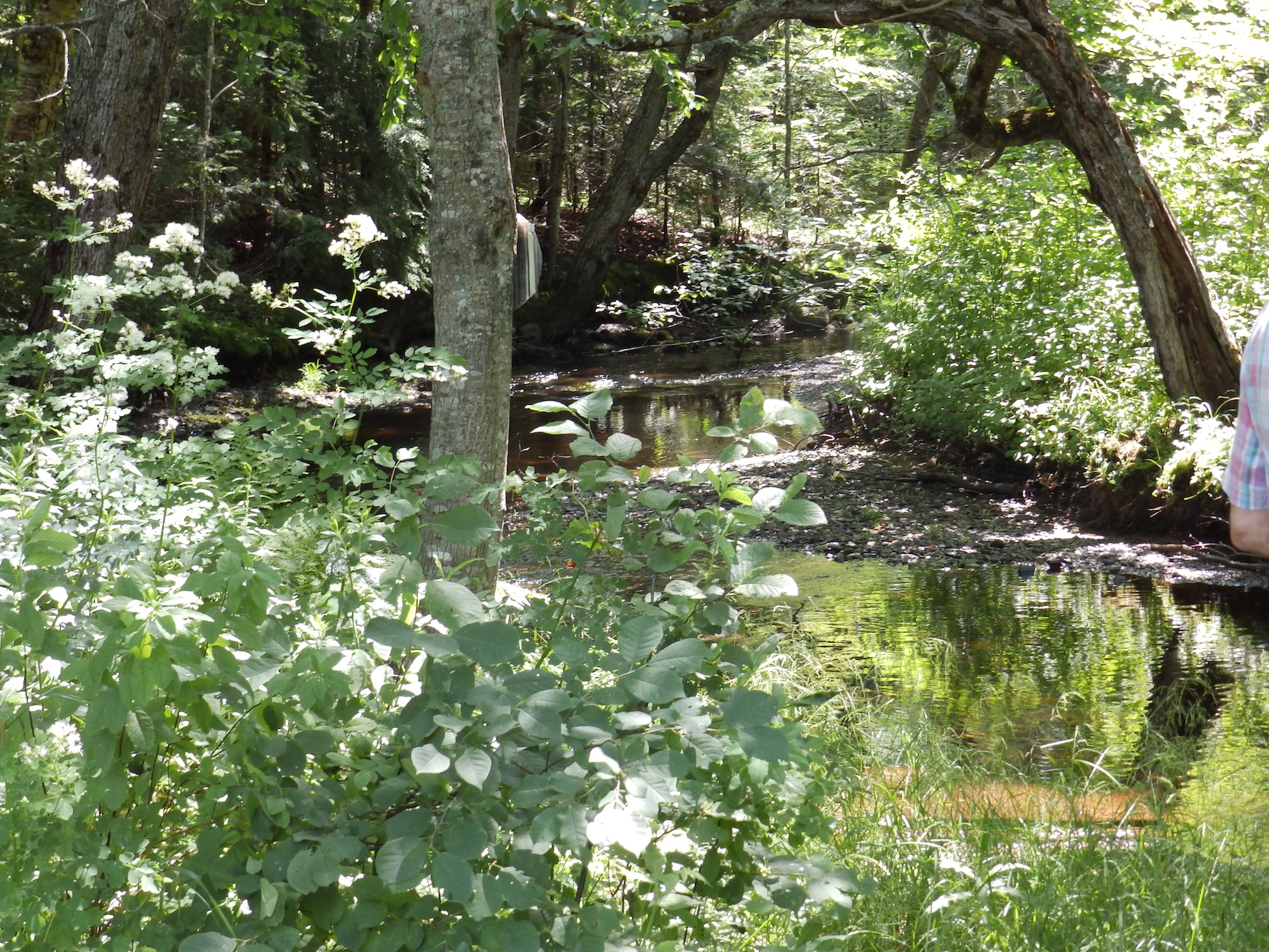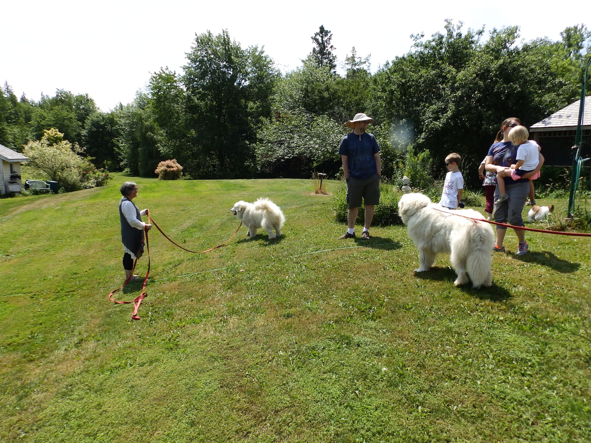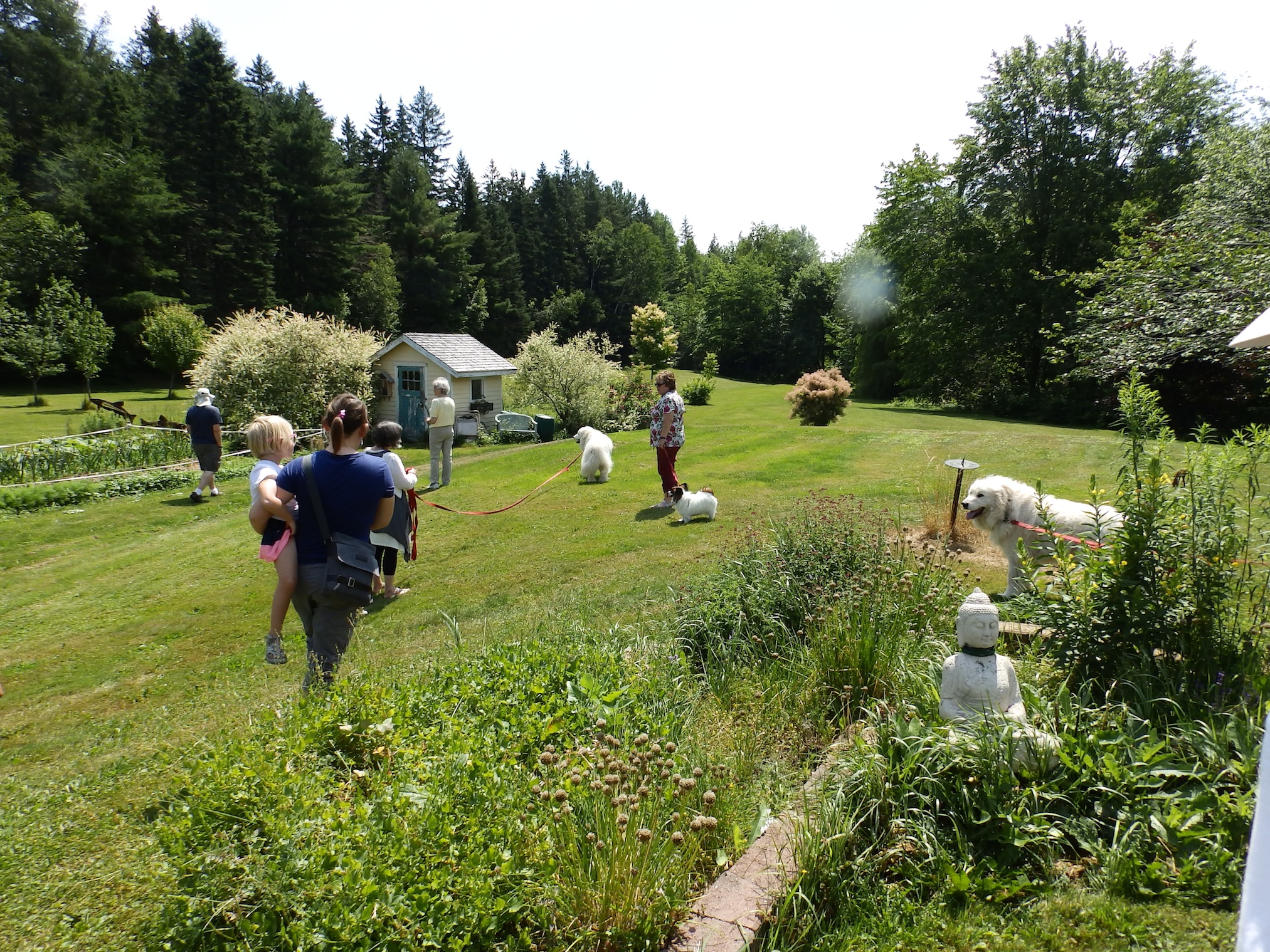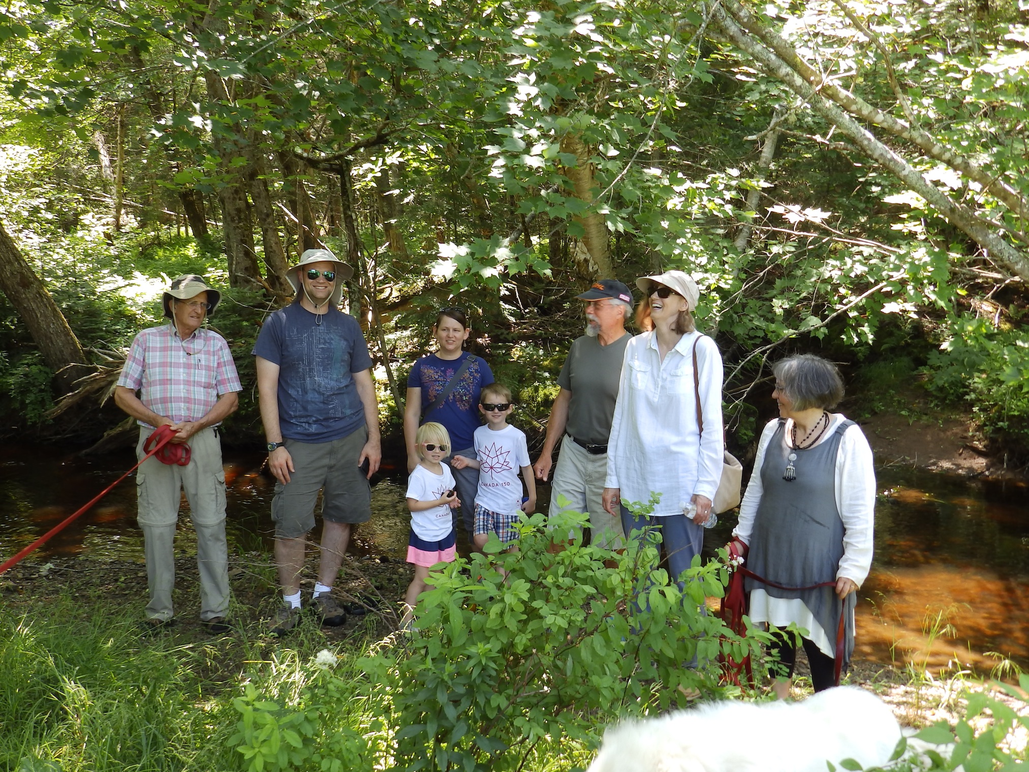 Walking toward the creek, L-R: Linda, Daniel (with crazy sunhat), Malcolm, Jamie holding Sadie, plus Linda and Tony’s white great Pyrenees dogs and Betty’s papillon, Rocket |