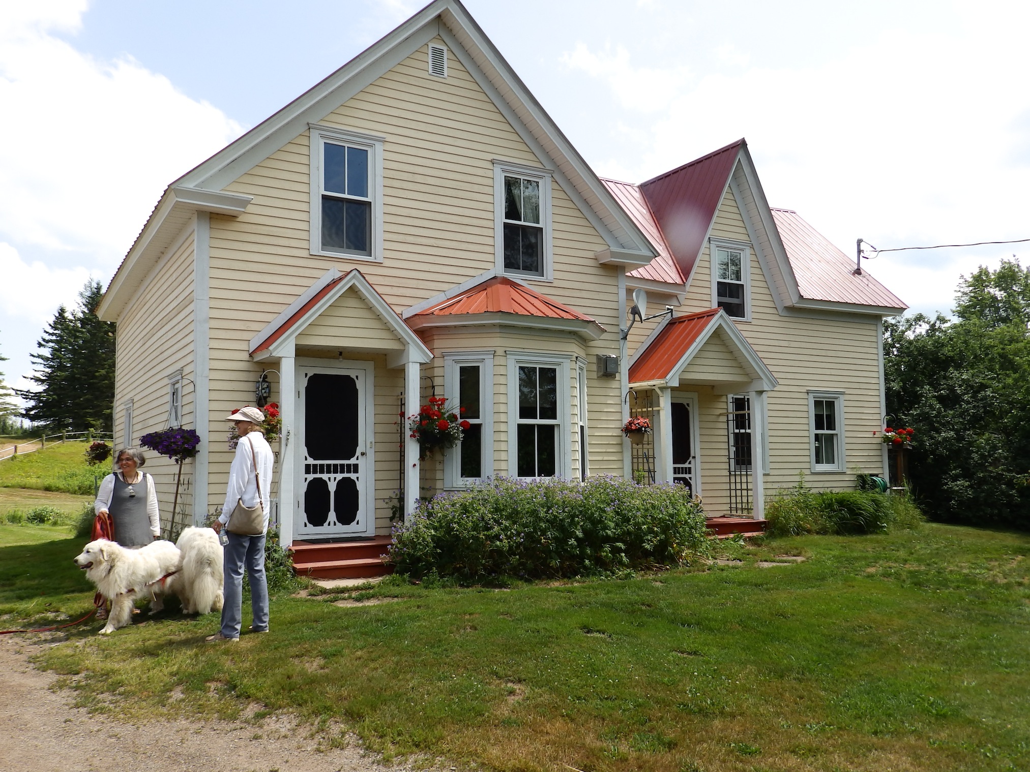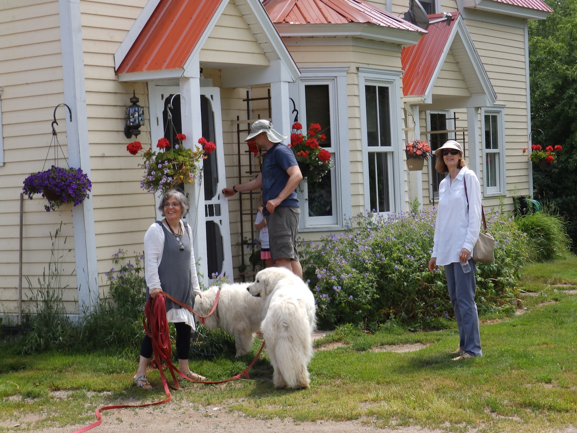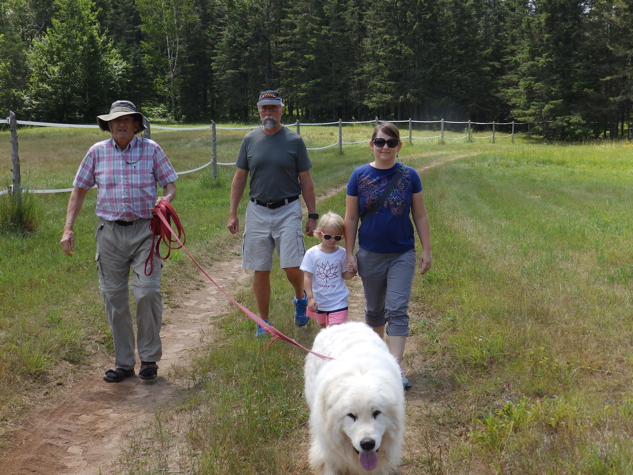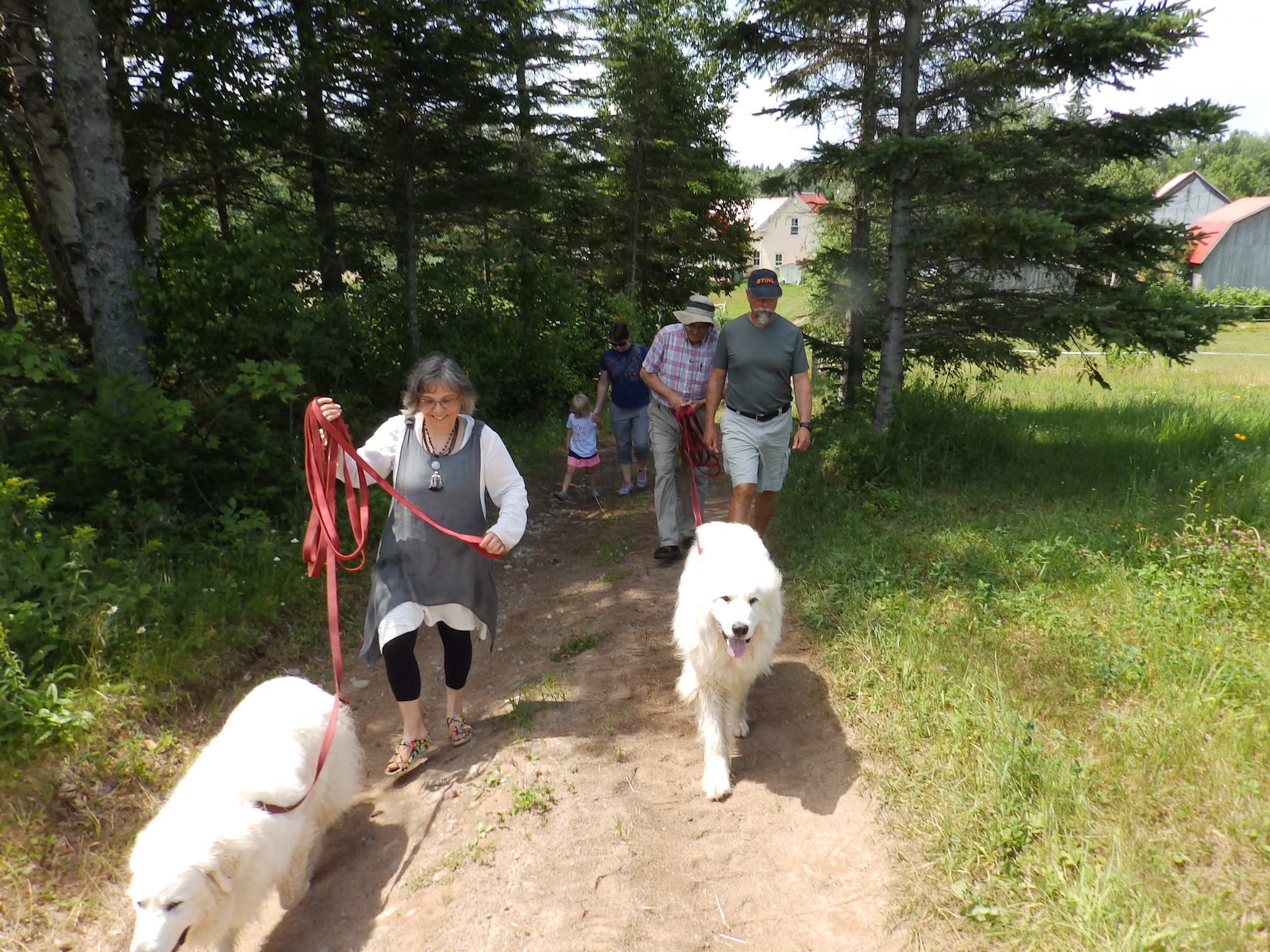 | Farm path on T&L’s property with Linda, Jamie and Sadie, Tony and Brian. The two big white dogs went everywhere with us. |
