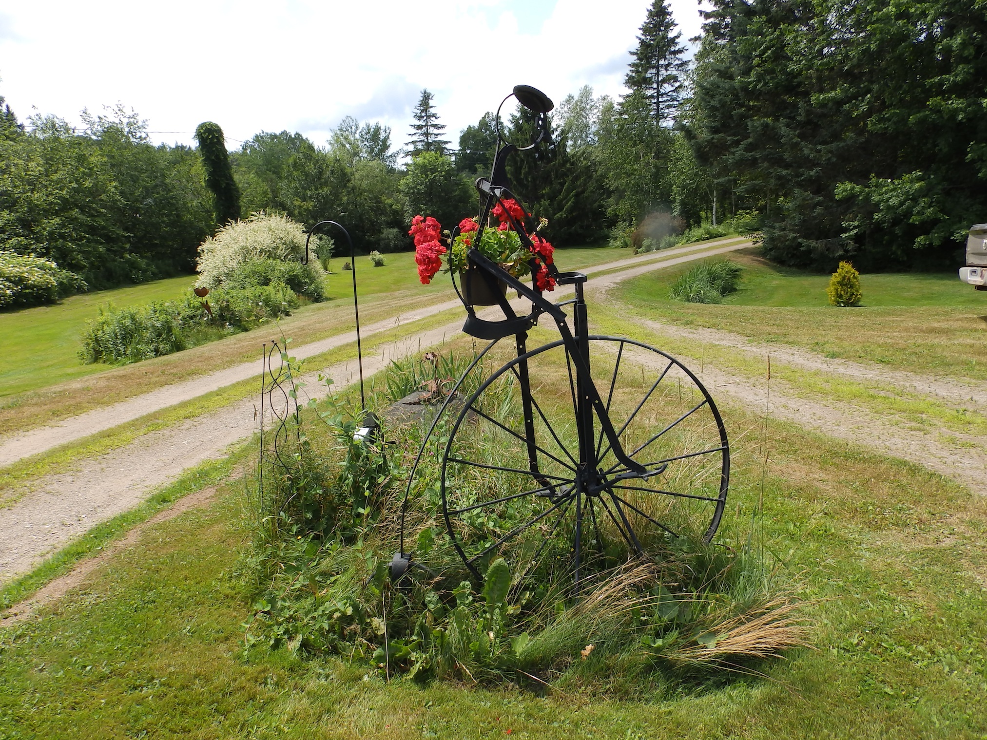 | Sculpture planter (antique bike) at the entrance to the farm |