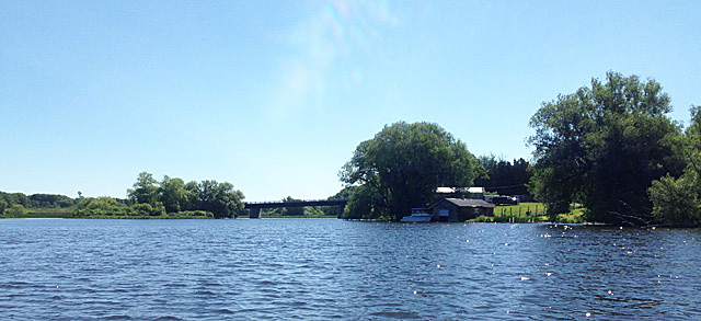 Approaching the bridge that we paddled under in a morning canoe trip up the Salmon River. (The wind was against us on the return, and it was harder going downstream than up.)