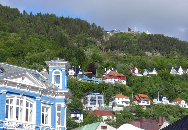 130. Bergen homes built into the hillside. In the background on the hilltop is the funicular with the fancy restaurant at the top, beside the viewpoint overlooking Bergen.