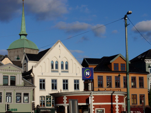 143. The tall spire is the oldest church in Bergen, the Domkirke.