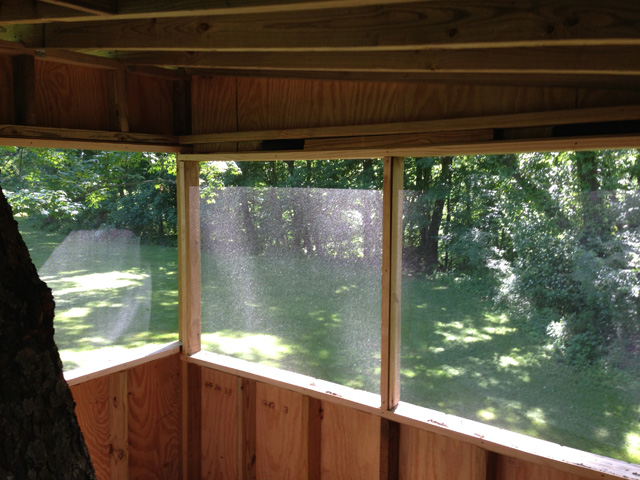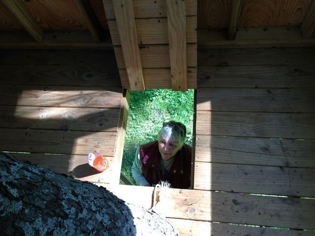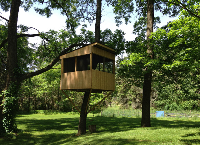 The treehouse features a trap door entered by a rope ladder