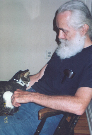 Catherine's Mr. Cat purring in Robert's lap, 7/10/05. Read Catherine's blog