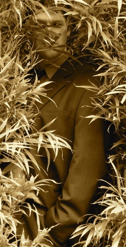Robin (in suit & tie) lurking in bamboo, Aug. 15, 2006