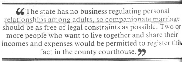 Published on the Opinions page of the Minnesota Daily (University of Minnesota student newspaper) April 13, 1977 An alternative to traditional marriage By JAMES PARK According to surveys in California, there are more people in the 21-30 age group in the state living together than are actually married. - Time Magazine, Jan. 10, 1977. The suggestion that we create two kinds of marriage, with different rituals, different licenses, and different responsibilities, was made back in 1966 by Margaret Mead. But the idea also was proposed in the 1920s by Judge Ben Lindsey. Since marriage is an arbitrary social arrangement that has emerged among the earth's inhabitants, it can be changed if we find some other patterns of relationship more to our liking. However, marriage laws and customs do not change quickly. We may not see two-level marriage until the year 2000. Even so, we can begin to think about the provisions we would like to see included in a new Minnesota law on domestic relationships. If Minnesota is one of the first states to consider alternative forms of marriage, it certainly will gain widespread coverage in the national media. Every family in America probably has some members who have tried different styles of relationships. Most suggestions for two kinds of marriage are some variation of this scheme: companionate marriage and parental partnership. If and when these two relationships are defined by state law, it really will not be such a radical departure from what we have now. It will just give legal standing to the ways many people have already decided to conduct their personal relationships.